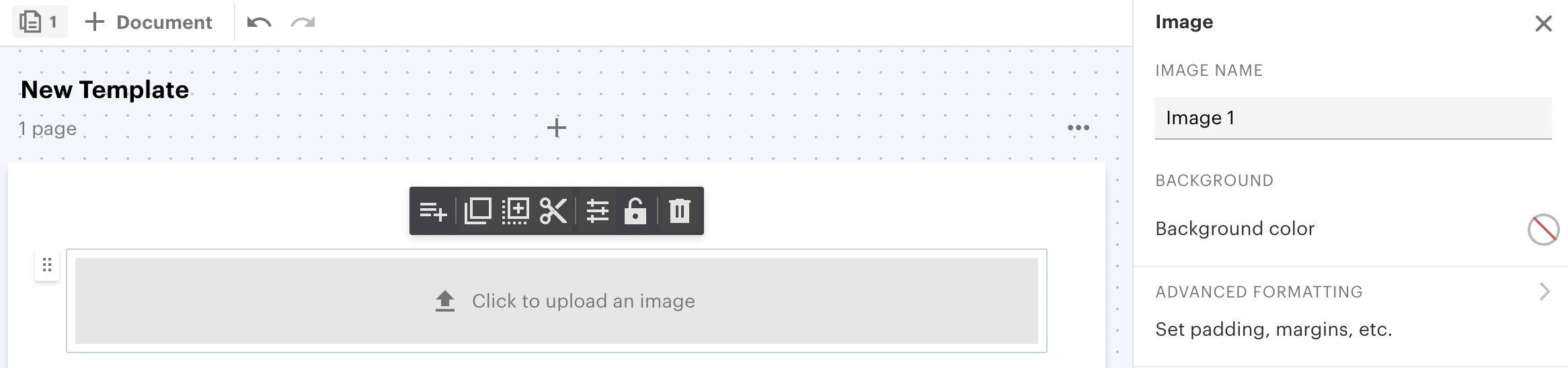 Open the template and drag-and-drop an Image block to the desired location. Open the properties to customize the Image Name. You'll use this name later to pass the image via the API.